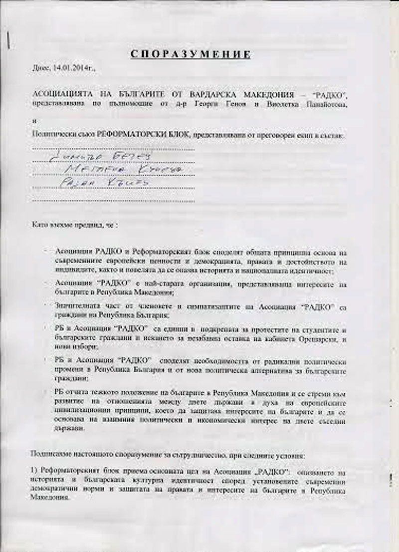 Така, след близо пет - месечни преговори, този обнадеждаващ договор стана действителност. Реформаторският блок обещава да защитава всички права на македонските българи и най-вече : тяхната КУЛТУРНА ИДЕНТИЧНОСТ.